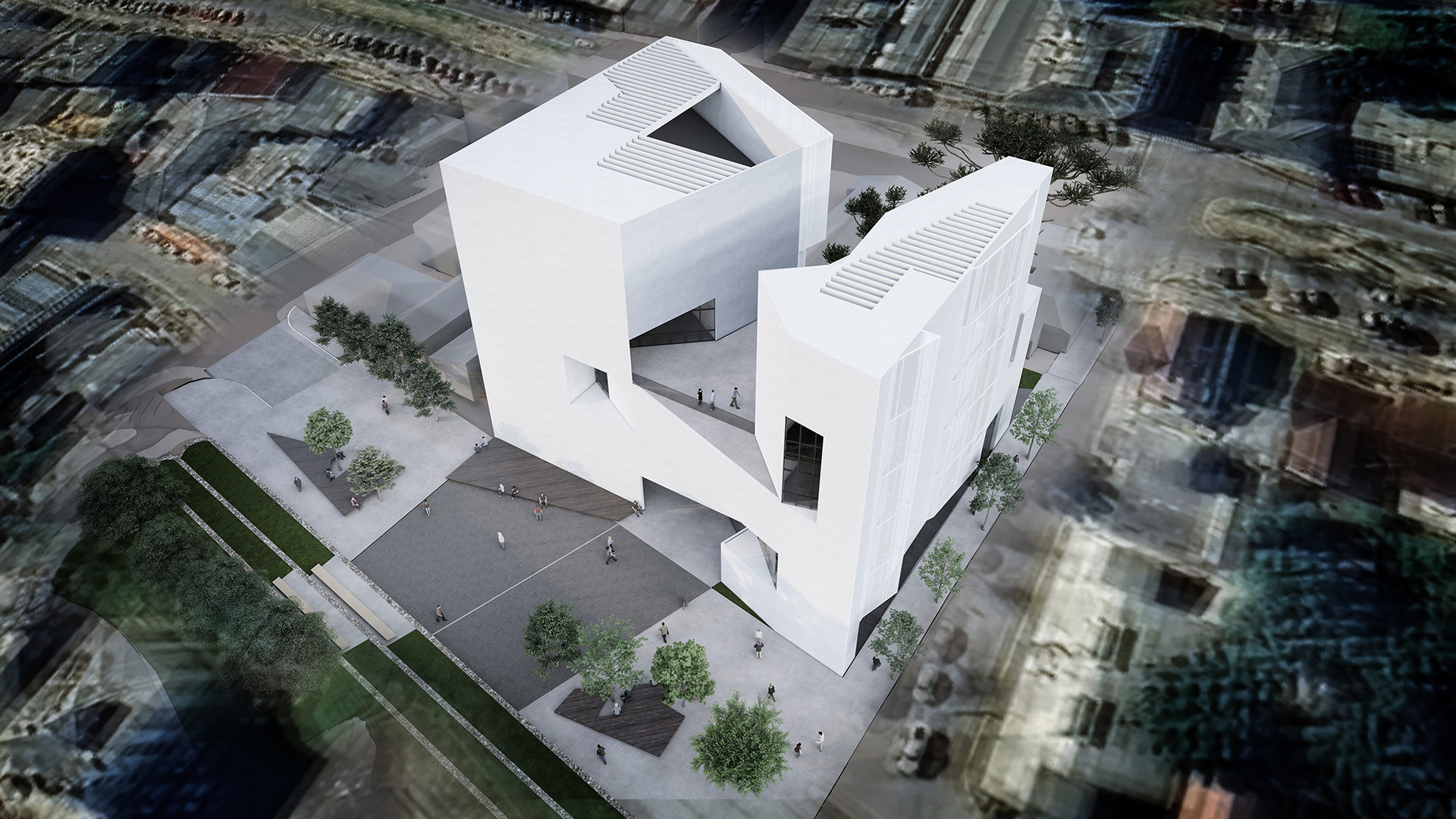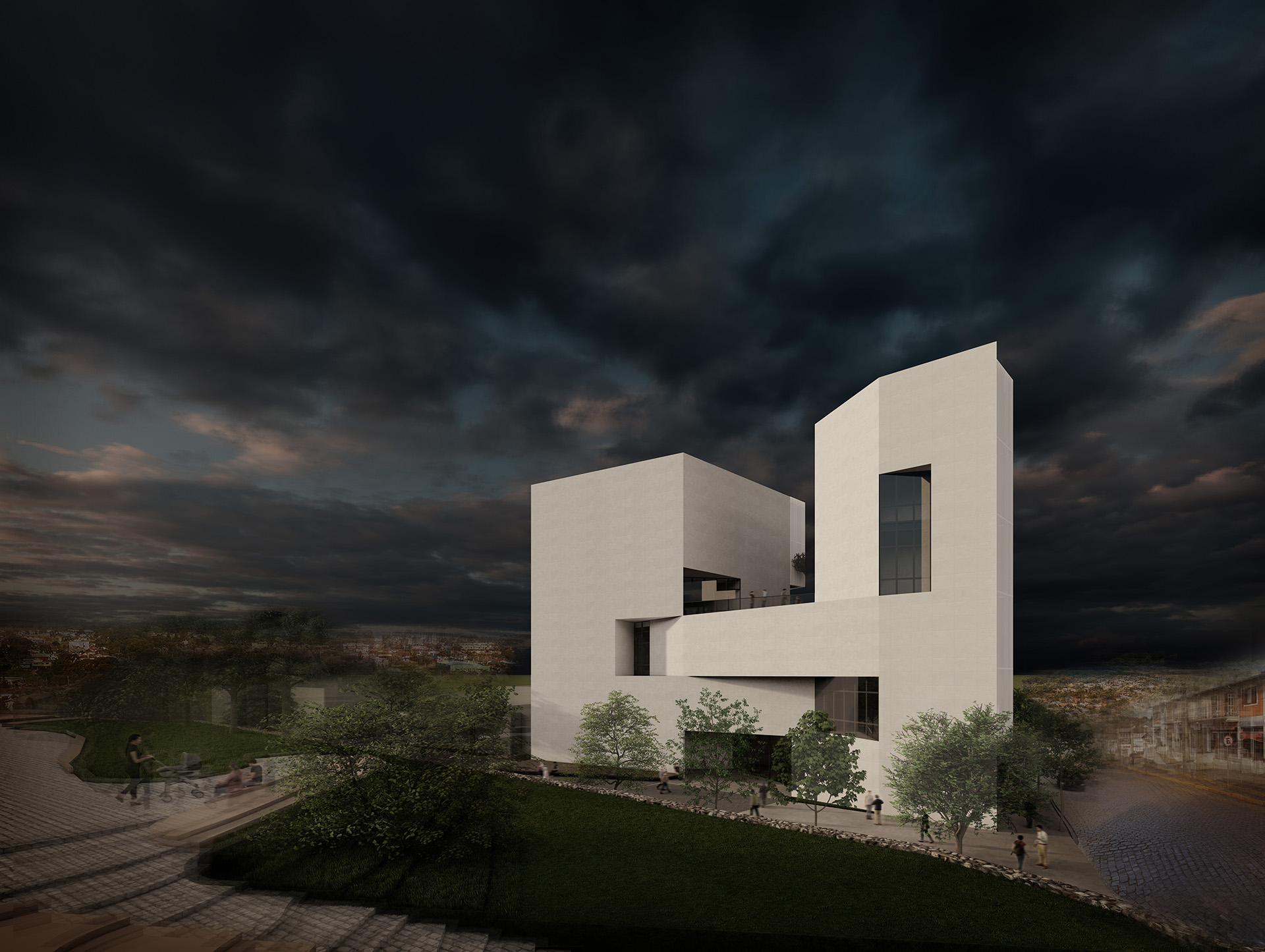 Foi justamente da alta taxa de ocupação do terreno que nasceu o desejo do edifício de se liberar ao máximo de sua pegada no solo. Para além de um obstáculo, o edifício abre um eixo de passagem em seu interior e liga a parte alta do centro histórico, a Praça Capitão Pedro da Silva Chaves e a Igreja da Matriz, com a sua parte mais baixa, o antigo prédio da Prefeitura e a Avenida Júlio de Castilhos. No meio do caminho entre esses dois polos, no meio do edifício da Universidade Estadual do Rio Grande do Sul – Unidade Hortênsias, nasce o ponto focal desta proposta: a praça da Universidade. Ao lado da edificação de importância cultural para a comunidade, sob a luz filtrada na grimpa das araucárias, lá os estudantes se esquentarão no calor do sol de inverno enquanto trocam ideias de como se é possível – e, sim, é possível – mudar o mundo. Afinal, para que serve uma universidade?