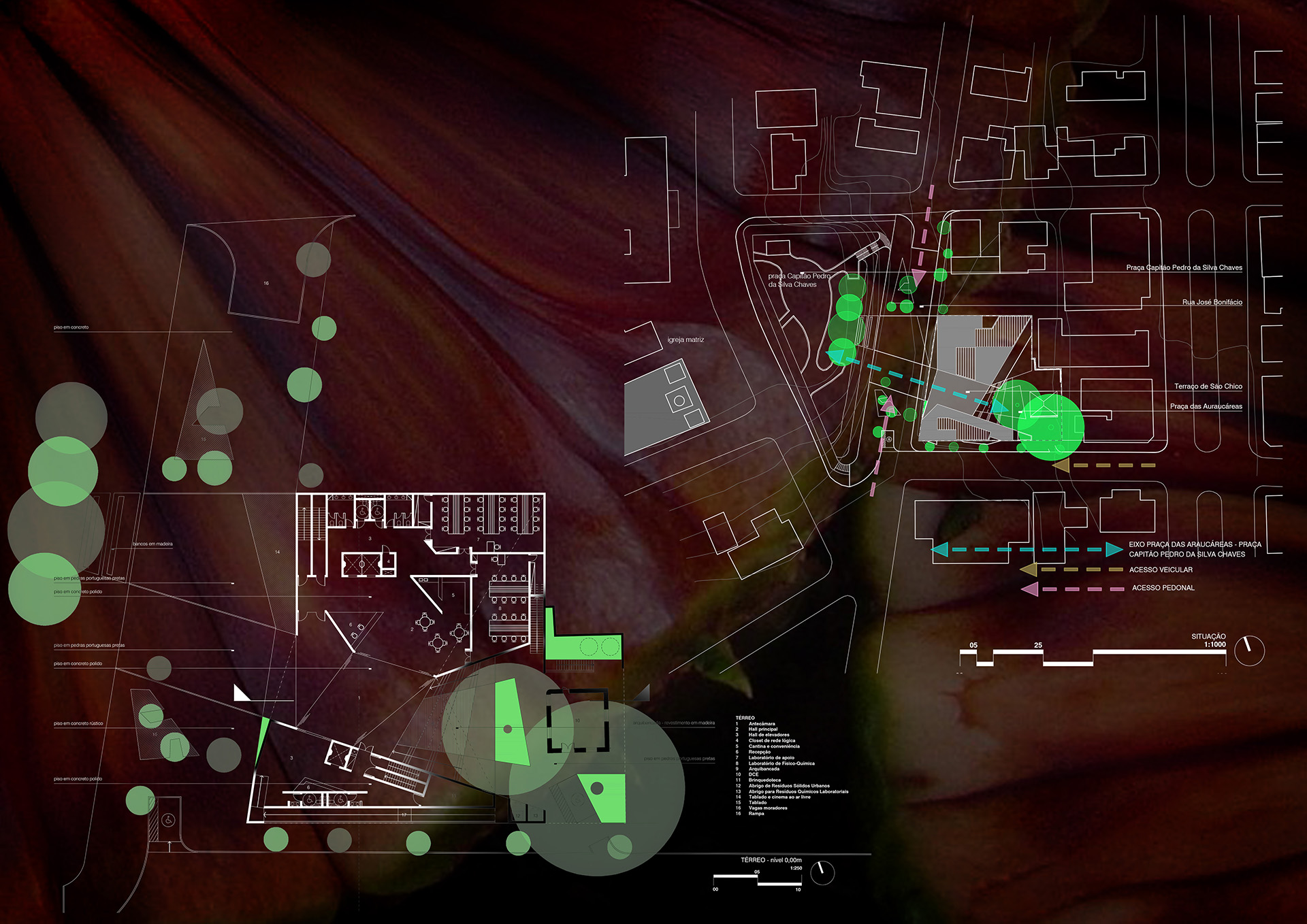 A Praça das Araucáreas, para além de ponto de encontro entre o estudo e o descanso, entre o público e o privado, entre o velho e o novo, entre a memória e o sonho, desempenha também papel fundamental nos sistemas espaciais desta proposta, na medida em que proporciona espaço de descompressão entre escalas tão diferentes. Essa função não é, contudo, desempenhada pelos tradicionais e artificiais elementos da Arquitetura – pedra, aço, paredes e tetos –, mas pelo seus singelos opostos: o vazio e a natureza. Neste ponto, a proposta chama à atenção outra pedra fundamental da Arquitetura: o tempo.