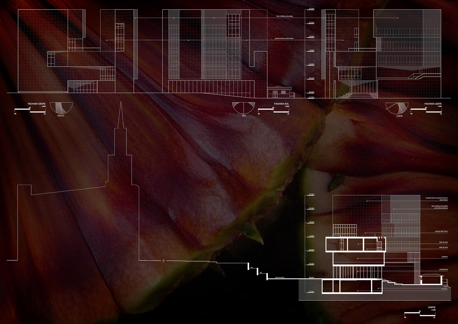 Desse modo, o ambiente acadêmico se define por salas de aula dispostas para o nascente, desnudadas em panos de vidro que se revestem de uma pele metálica extrudada que confere privacidade ao mesmo tempo em que permite a chegada do mundo exterior para dentro do local de aprendizado, sem ofuscamentos e significativos acréscimos de carga térmica ao ambiente. Em uma camada adicional de proteção, as aberturas desses espaços são protegidas por generosos beirais que se transformam, ao nível do piso das salas de aula, em largas jardineiras que atuam como filtros de poeira e catalisadores da qualidade do ar.