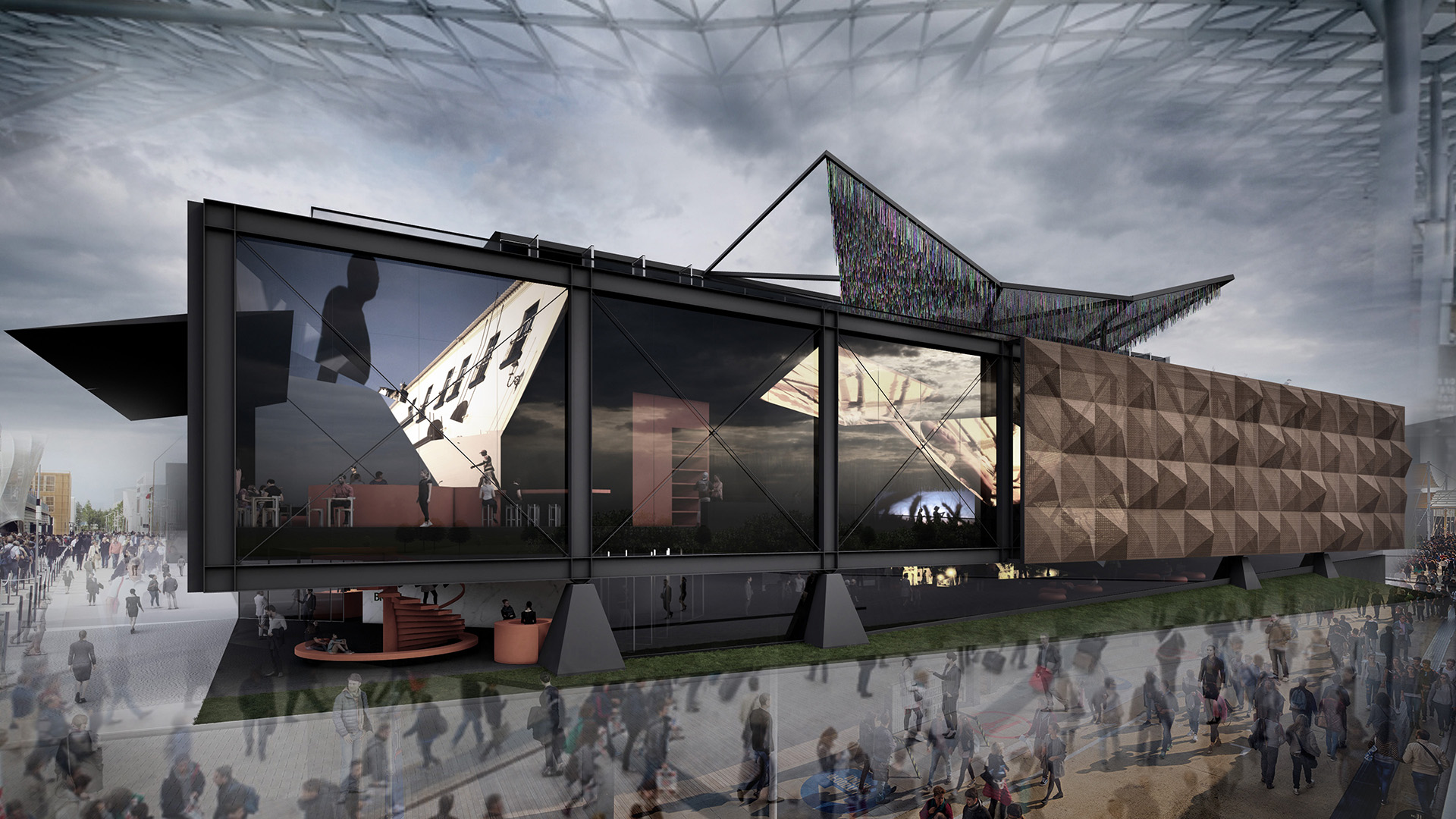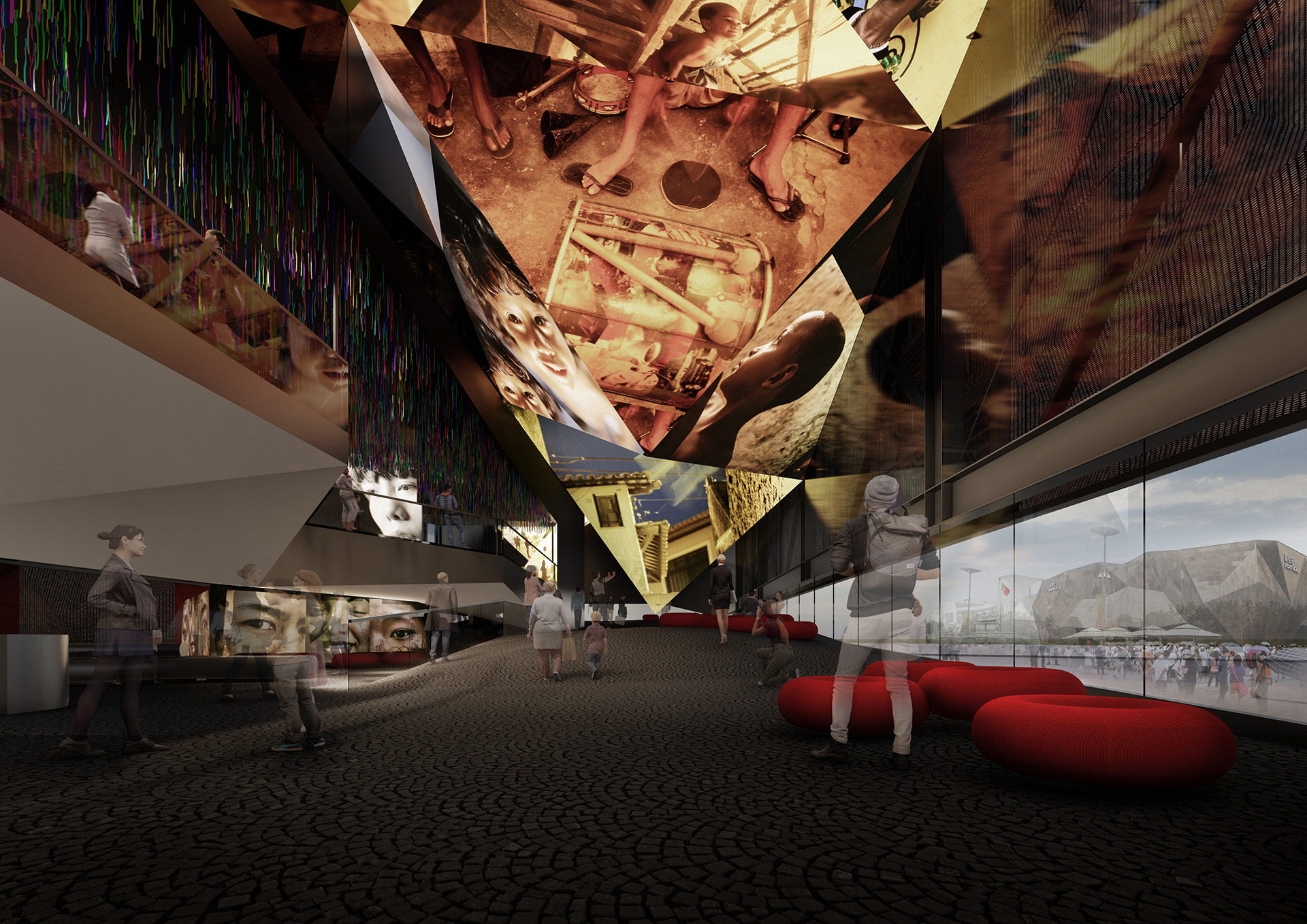 Projetado para abrigar a experiência expositiva, o edifício é melhor definido não como um fim, mas como um meio. Não é o viajante, mas o navio no qual a viagem é feita. O edifício deverá, então, ser sólido o suficiente para abrigar seus passageiros, mas também diáfano o suficiente para deixar a exposição derramar-se por toda a praça da feira mundial.