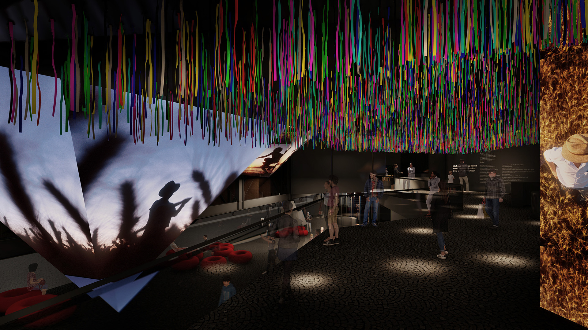 Como as telas estão distribuídas majoritariamente no teto, o percurso da exposição é conformado como uma rampa, garantindo ao mesmo tempo um melhor ângulo para se observar as projeções, um percurso circular para toda a experiência expositiva – sem cruzamento de fluxo para o público –, e acessibilidade universal conseguida apenas com um uso mínimo de sistemas mecânicos convencionais.